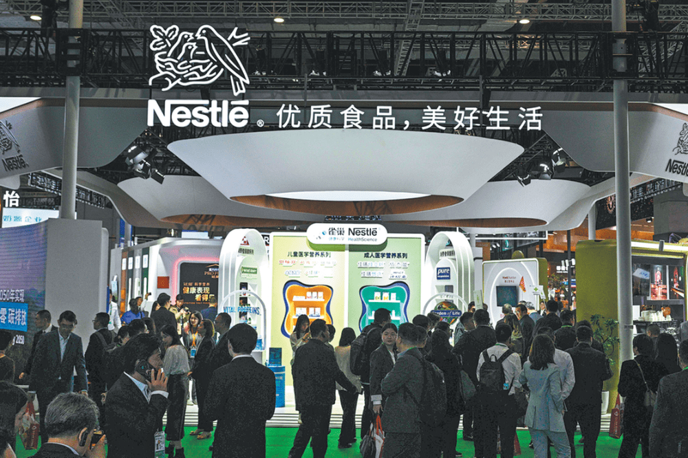 Visitors gather at the exhibition area of Nestle during the eighth China International Import Expo in Shanghai on Nov 5. HECTOR RETAMAL/AFP
