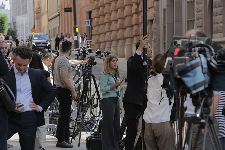 Reporters from international media wait outside Rosenbad, the Swedish prime minister’s office, on Monday morning in Stockholm, Sweden. [Photo by Xing Yi/chinadaily.com.cn]