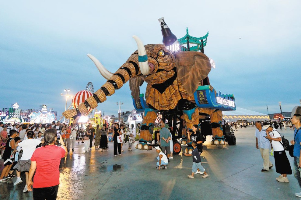 People watch and take pictures of a nine-meter-high and 16-meter-long mechanical elephant during the 23rd Harbin International Beer Festival in Harbin, Heilongjiang province, on Aug 9. ZHANG SHU/FOR CHINA DAILY