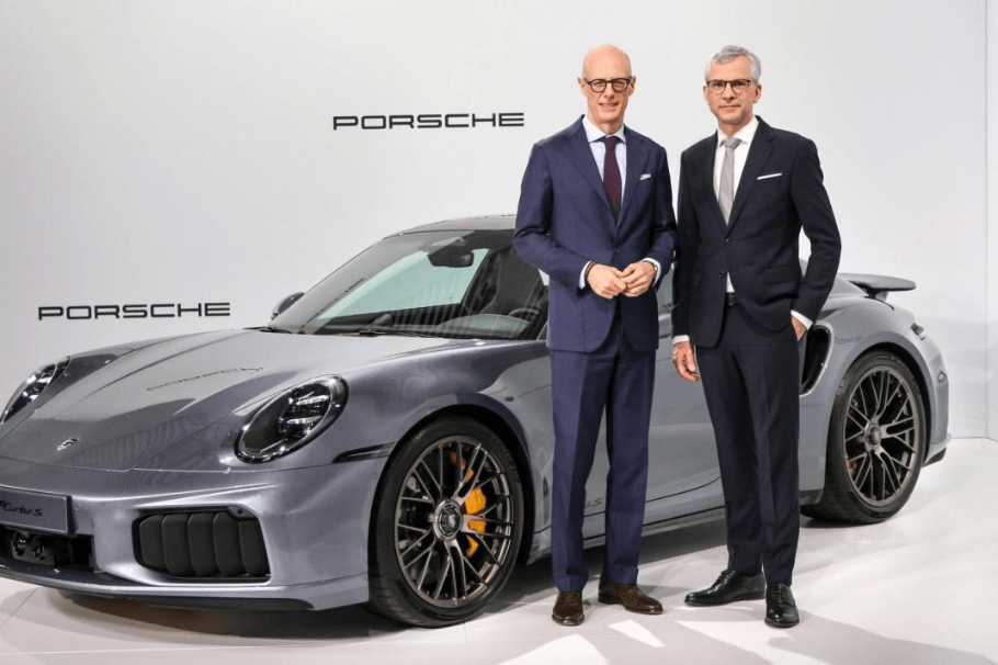 Porsche CEO Michael Leiters and CFO Jochen Breckner pose for a photo in front of a 911 Turbo S. [Photo provided to chinadaily.com.cn]