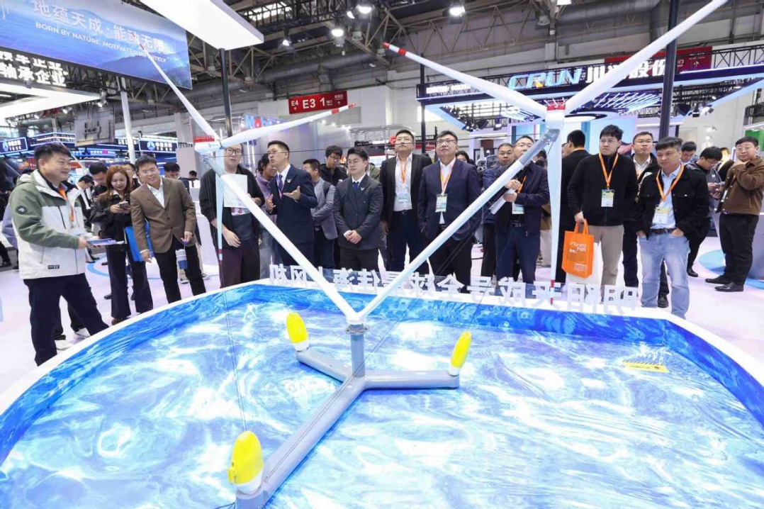 Visitors check out an offshore wind turbine model during a clean energy expo in Beijing on Oct 20. CHEN XIAOGEN/FOR CHINA DAILY