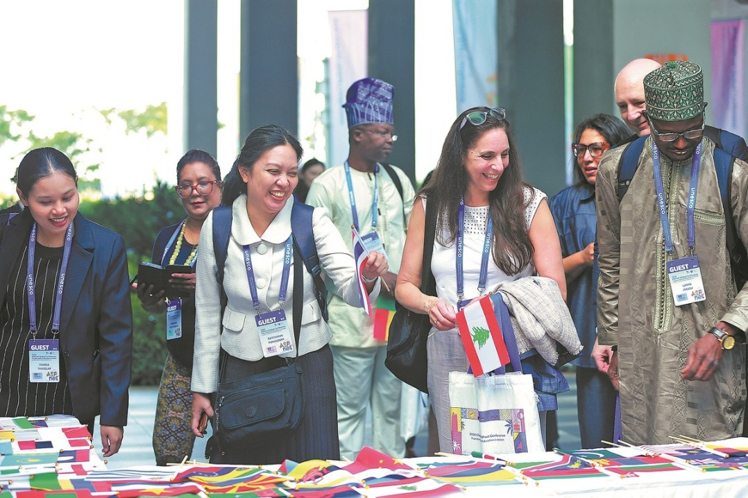 Guests attending the UNESCO ASPnet 2026 Global Conference find their countries’ national flags, ahead of the opening ceremony in Sanya, Hainan province, on Tuesday. The event brings together ASPnet national coordinators from around the world. [Photo provided to China Daily]