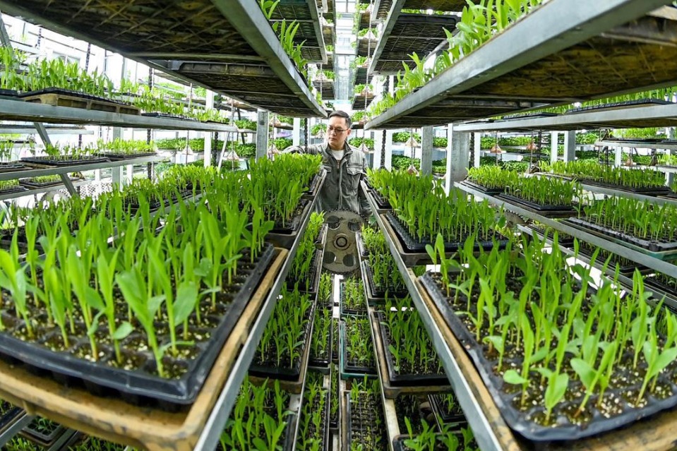 Workers check on the growth of corn seedlings at a smart seedling cultivation center in Muba township, Peng’an county, Sichuan province, on Tuesday. [Photo by Liu Yonghong/For chinadaily.com.cn]