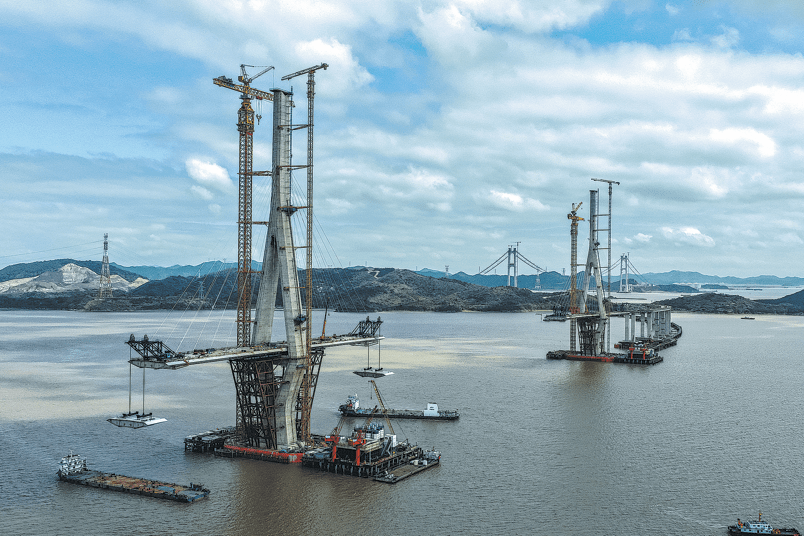 An image captures the construction of the Qinglongmen Bridge, linking Fodu and Meishan islands in Zhejiang province, on Wednesday. Spanning 756 meters, the project — jointly built by units of China Railway Construction Corp — stands as the largest steel box girder cable-stayed bridge with three towers in the world. YAO FENG/FOR CHINA DAILY