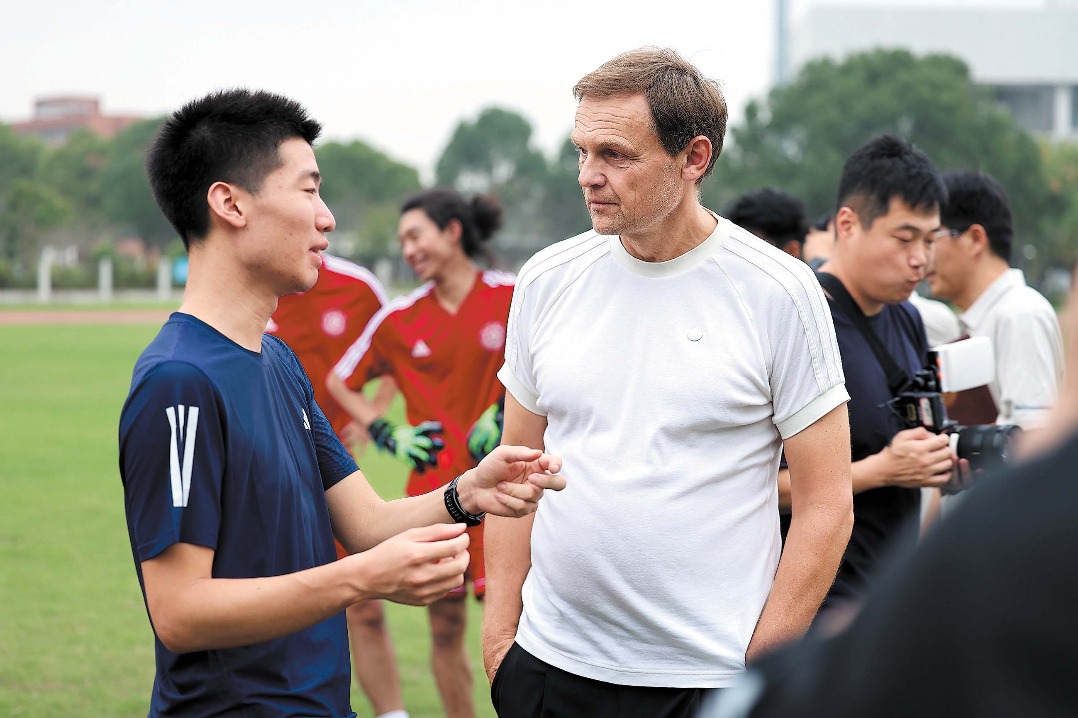 Adidas Global CEO Bjorn Gulden interacts with a student at Shanghai Jiao Tong University. CHINA DAILY