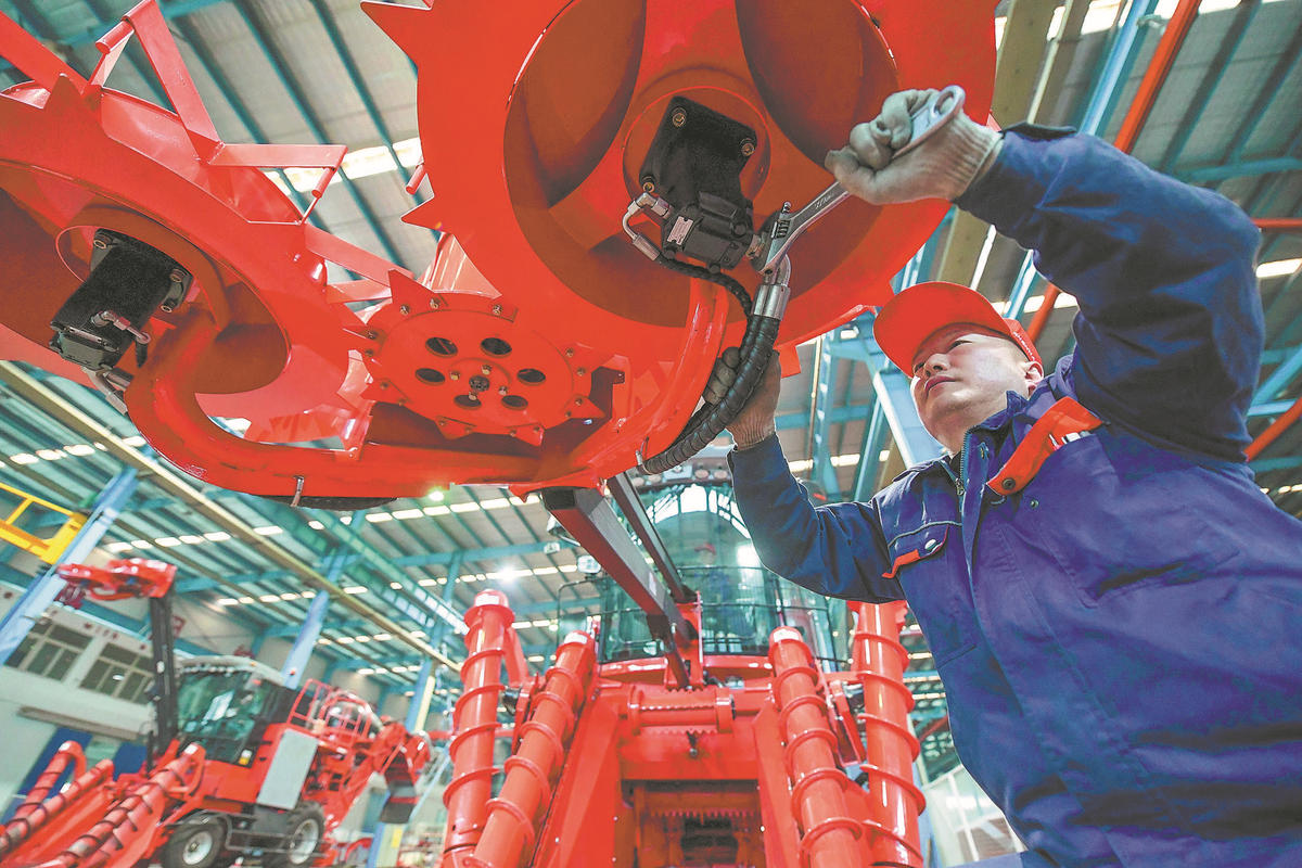An employee works on the assembly line of a private cane harvester manufacturer in Luoyang, Henan province. ZHANG XIYI/FOR CHINA DAILY