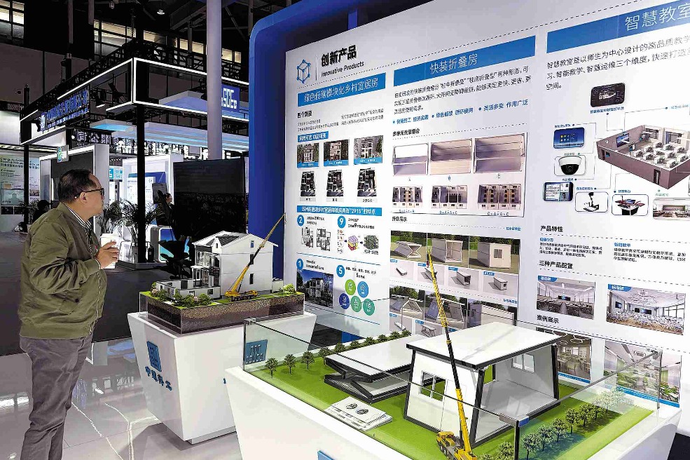 A visitor looks at innovative products related to green and low-carbon housing at an architectural exposition in Nanjing, Jiangsu province, in April. WANG LUXIAN/FOR CHINA DAILY