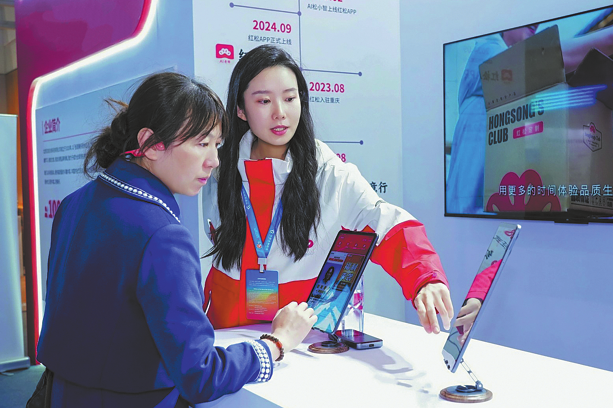 A staff member (right) of Beijing Hongsong Online Technology Co Ltd answers a visitor’s queries about the company’s products during an industry expo in Beijing in October. CHINA DAILY