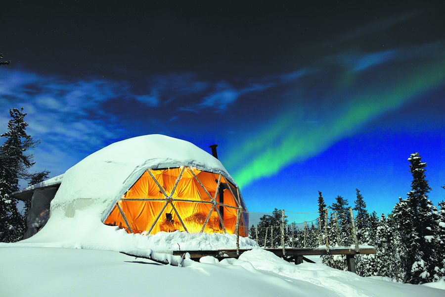 Under a sky streaked with northern lights, a snow-covered dome lodge glows in the Northwest Territories of Canada on Feb 27, 2025. [Photo/Destination Canada]