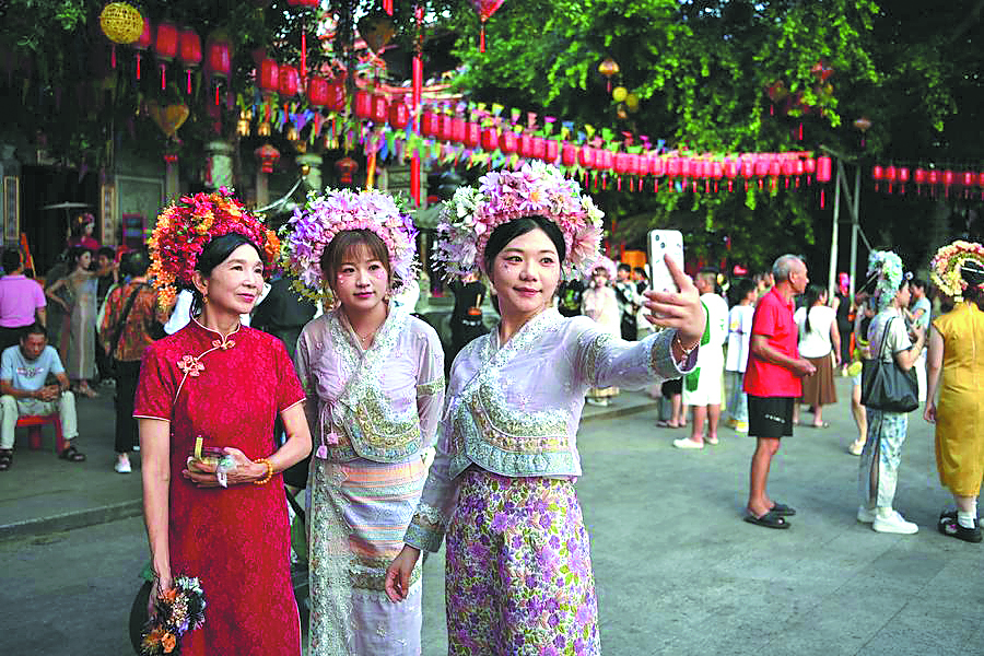 In August 2025, visitors wearing floral headpieces pose for selfies in Xunpu village, Quanzhou, Fujian province. [Photo/Xinhua]