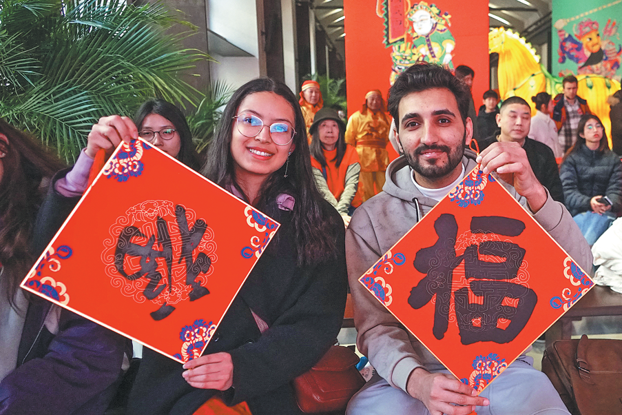 Foreign students studying in Tianjin show the Chinese character fu (meaning blessing or happiness) during the Spring Festival. CHINA DAILY