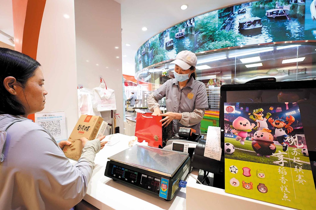 Time-honored Beijing snack brand Daoxiangcun in Suzhou, Jiangsu province, offers Suzhou-style pastries to attract customers on June 29. CHINA DAILY