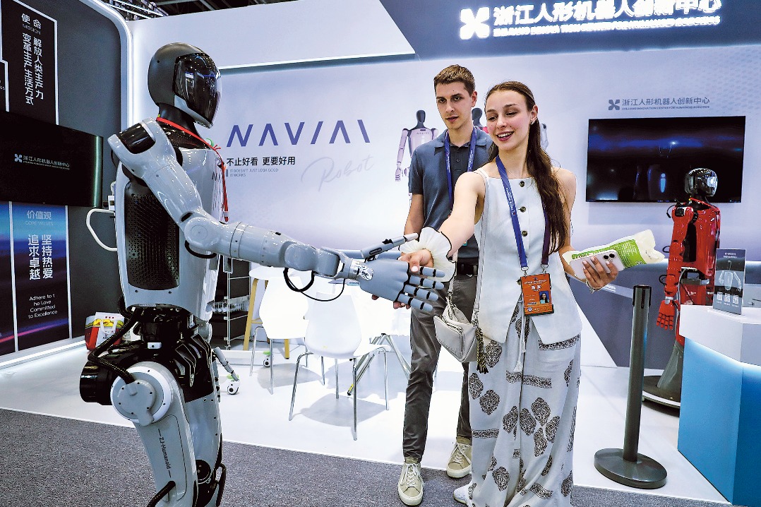 A guest shakes hands with a humanoid robot at the ongoing fourth China-CEEC Expo in Ningbo, East China’s Zhejiang province. ZHANG WEI/CHINA DAILY