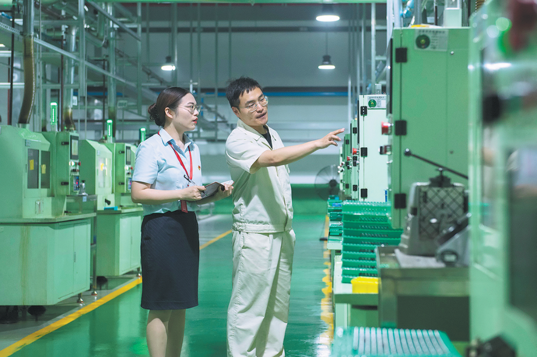 A manager (left) from China Construction Bank visits a manufacturing client to inspect the use of credit funds and learn about the company’s operations in Nantong, Jiangsu province. XU JINGBAI/FOR CHINA DAILY