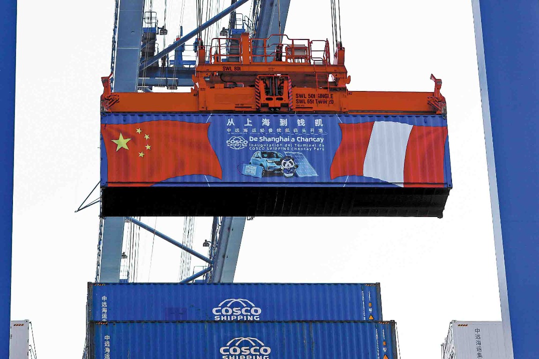 A container being moved at Chancay Port in Peru in November. LI MENGXIN/XINHUA