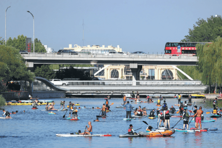 Urbanites are turning to outdoor water-related activities for relief this summer. In Beijing, paddleboarding on Liangma River has quickly emerged as one of the most popular ways to cool off, stay fit and socialize.
