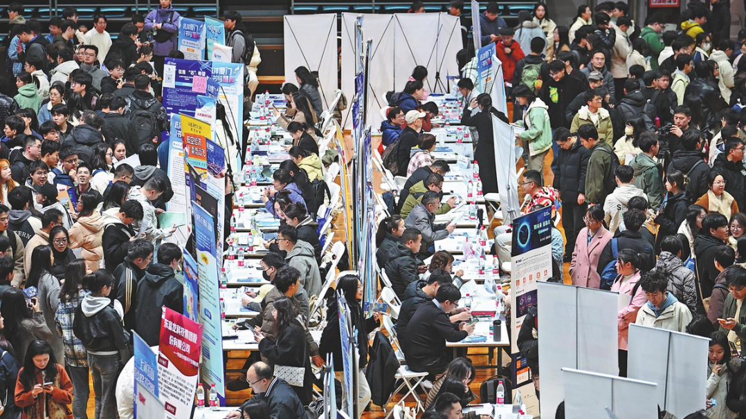 College students look for employment opportunities at a job fair on March 14 at Nanjing University of Aeronautics and Astronautics in Nanjing, Jiangsu province. More than 500 companies from across the country in fields such as artificial intelligence, low-altitude economy and new energy offered positions. YANG BO/CHINA NEWS SERVICE