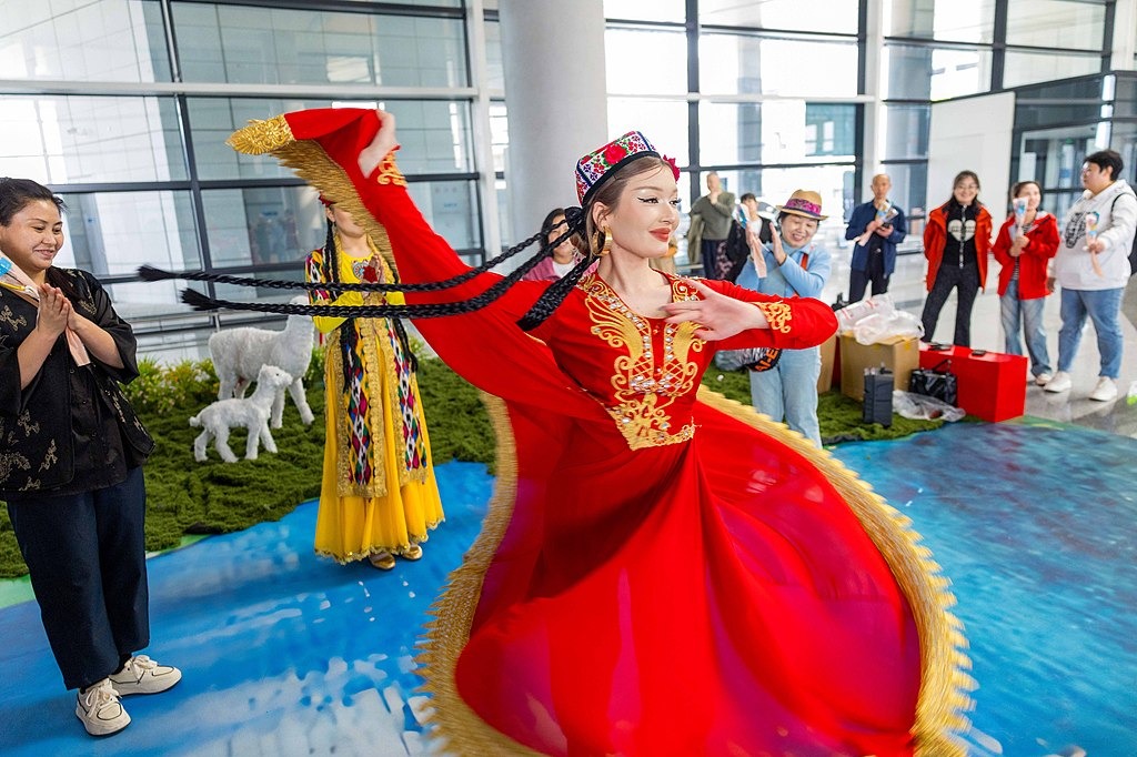 A dancer welcomes visitors with a traditional performance at Urumqi Tianshan International Airport in the Xinjiang Uygur autonomous region, on April 11, 2026. [Photo/VCG]