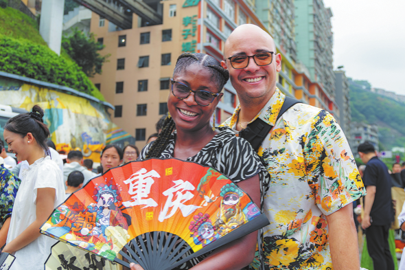 Two Canadian tourists enjoy “slow living” in the bustling streets of Liziba, Chongqing, on Oct 3, as the city has continuously cultivated and developed itself as an international consumption hub. HUANG WEI/XINHUA